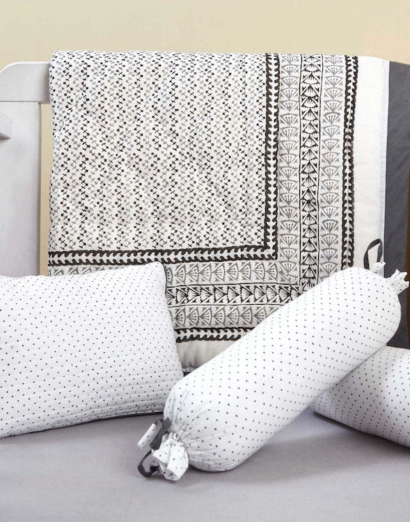 • Quilt Size: L50' x W38'; Fitted Crib Sheet: L52" x W28"x 8"; Pillow: L12' x W9'; Bolster: W6.5'x L16" (Comes with the covers and actual cushions in a set) • Wash Care: Machine wash cold- Delicate cycle; Hang dry Handmade in India: Due to the handmade nature of this product, variances may occur in color and design, making each piece simply unique.