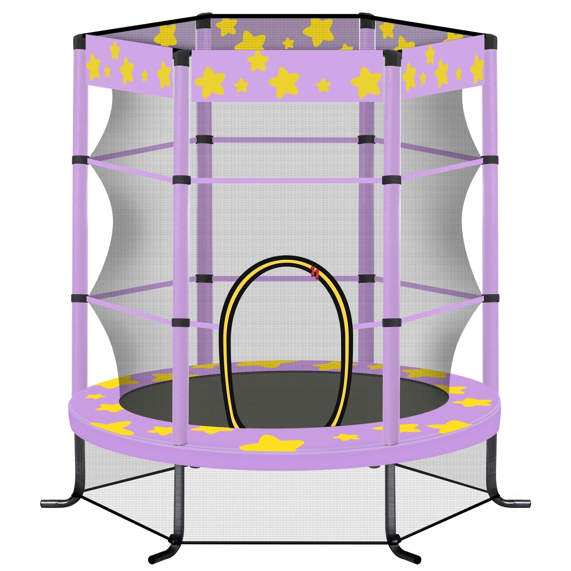 - [Protective Padded Frame] This 55' kids trampoline is so complete with safety details, including the 360-degree enclosure net and safety pad around the frame that creates a safe roomy space for entertaining activities, while the double pull zippers allow for easy access in and out of the trampoline. Foam-padded poles buffer unexpected collision while jumping, and the mesh net bottom is sewn to the jumping mat to eliminate gaps between.