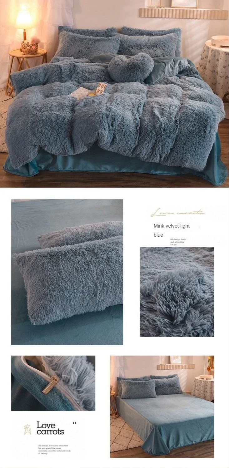 Winter Warm Blue Bedding Set Soft Plush Kawaii Mink Velvet Queen Duvet Cover Set Sheets Pillowcase Single Double Bedding Sets